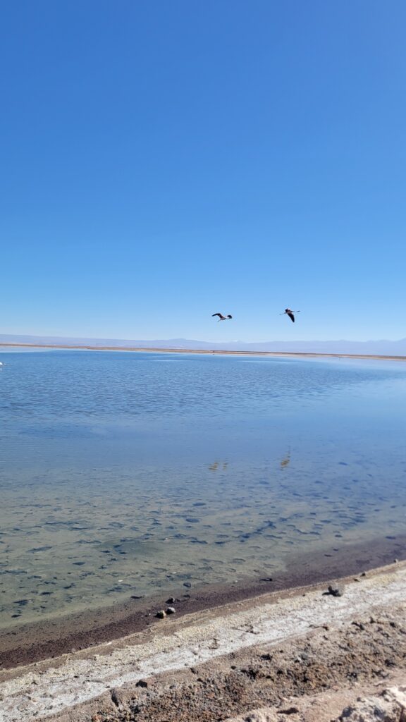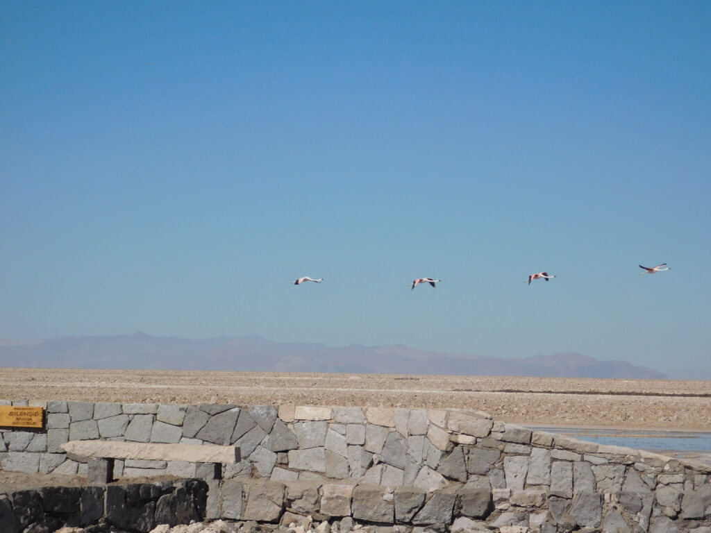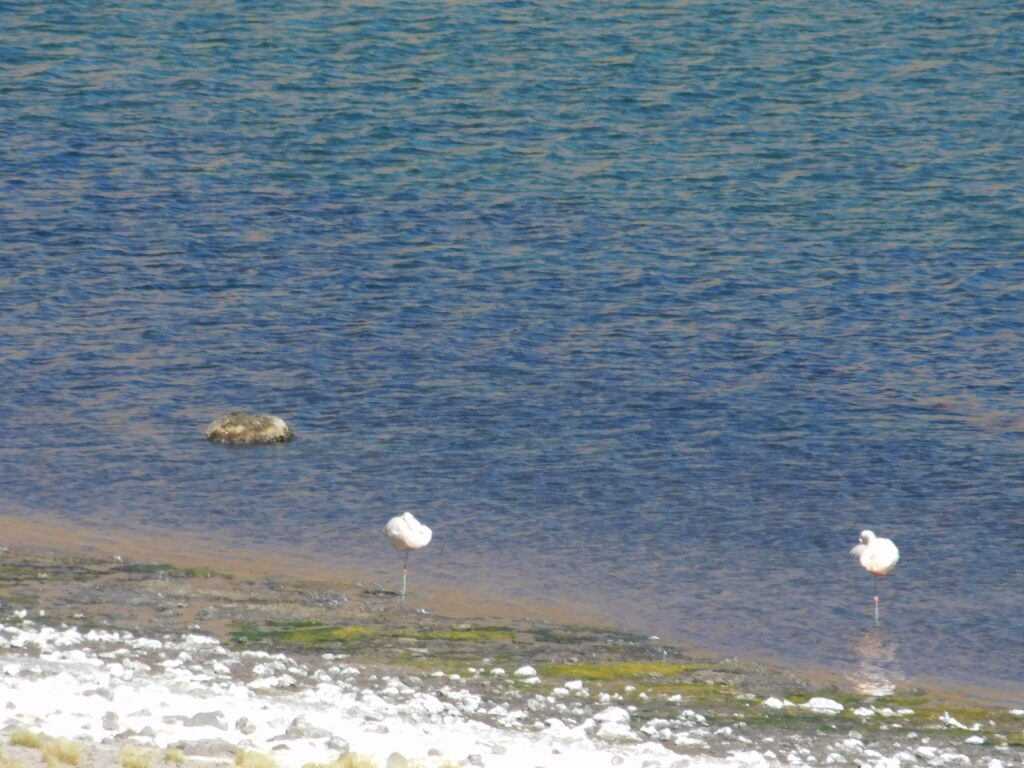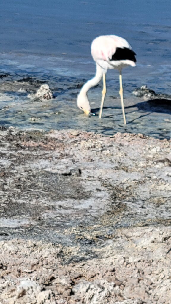 They feed 17 hours a day! There are three species of flamingos in the desert. We saw only two of the species here. The Chilean Flamingo (it has pink tailfeathers and pink knees and feet).