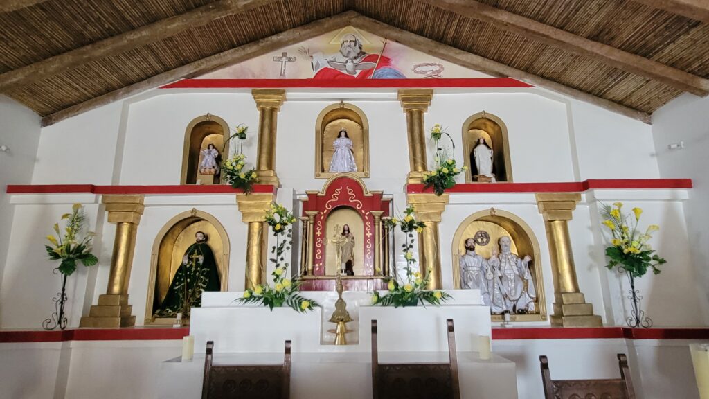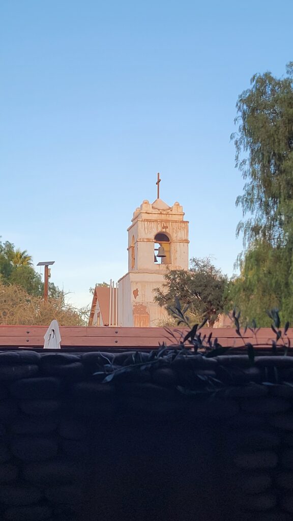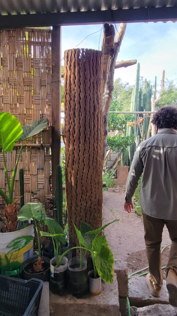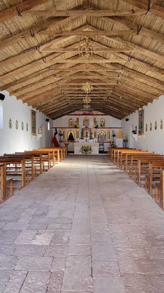 It is difficult to see in the photo of the inside of the church, but the ceiling is partially made of cactus wood. The cactus looks like a saguaro, but the center is wood like the post below.