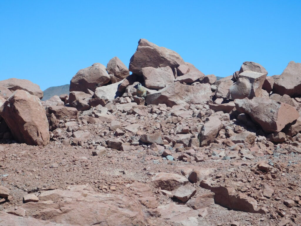 As we were leaving the red rocks park, we saw a Viscacha sunbathing outside his den. It is a rodent to the residents of Atacama. See if you can spot him in the photo below.