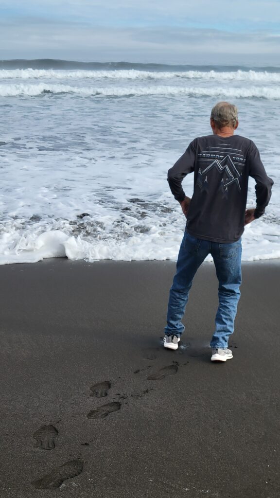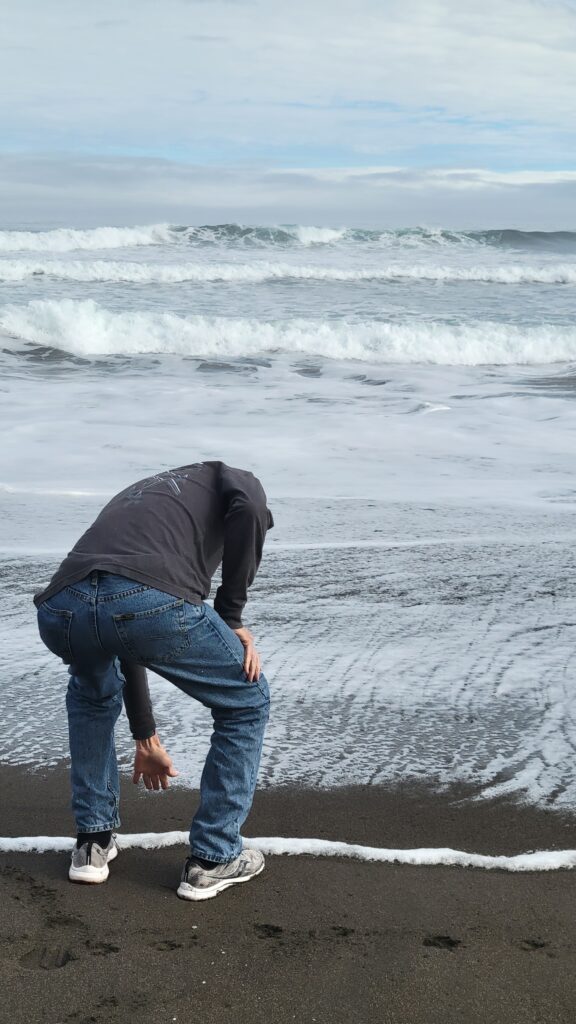 Bill wanted to feel the water temperature and then a wave came…so he ran…