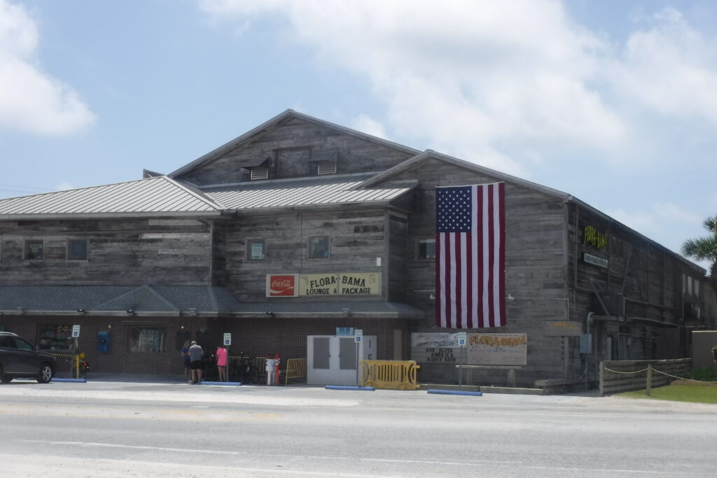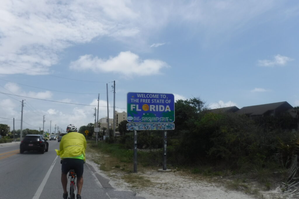 Lunch was across from the Flori Bama bar. Not the right time of day to stop in and see what the bar had to offer. I guess we will have to return by car – or not. There was no shade in the parking lot where lunch was served so we stayed about 20 minutes and took off to ride the remaining 25 miles to Pensacola. Just a few yards down from lunch, we encountered the Welcome to Florida sign.
