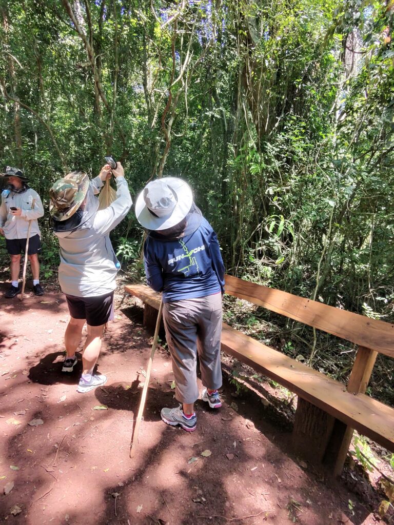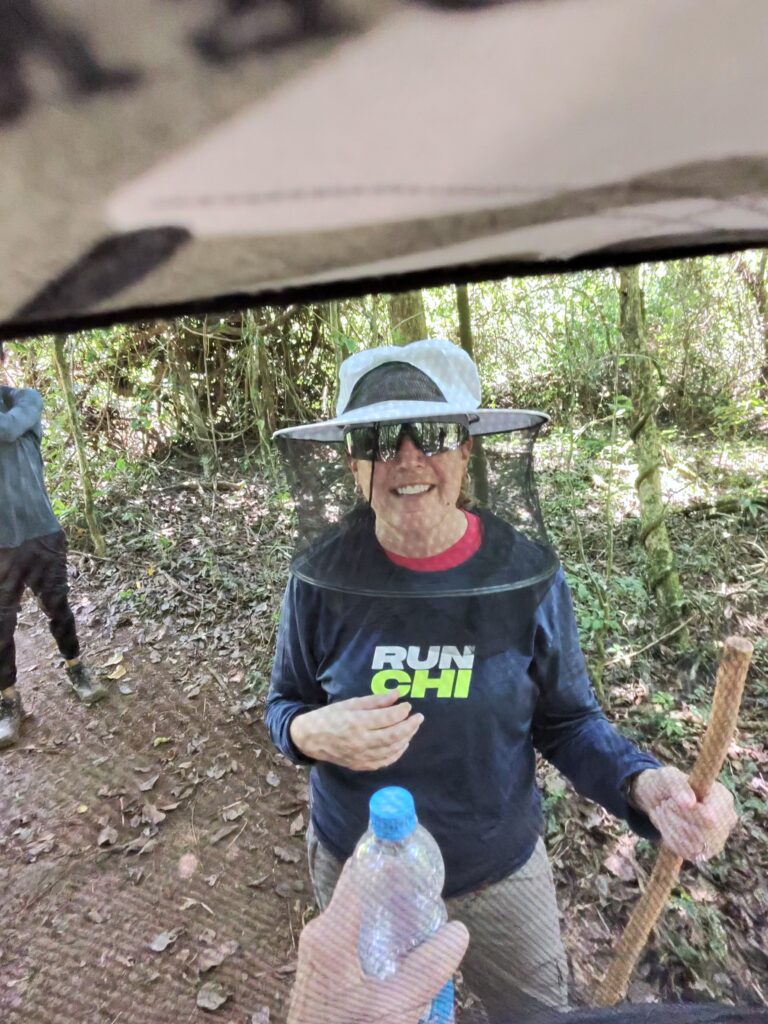 After kayaking, we stopped to put on hats with mosquito netting and grabbed walking sticks. While the trail was a bit steep at the beginning, I think the walking sticks might have been a bit of overkill, but the mosquito netting was not a joke. There were swarms of mosquitos that would have eaten us alive had we not been wearing long sleeves and pants and the hats with mosquito netting.