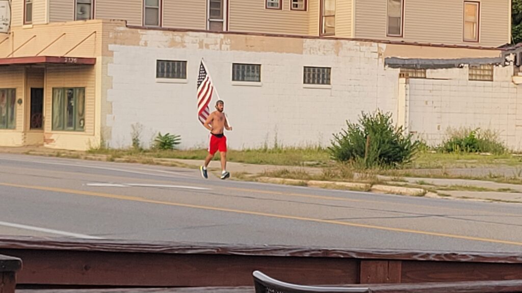This guy ran by us when we were at dinner with Dan and Cecelia. He appeared to run this way frequently as he held the flag upright the entire time.
