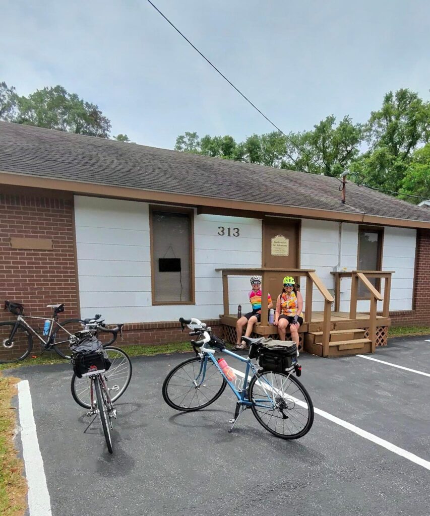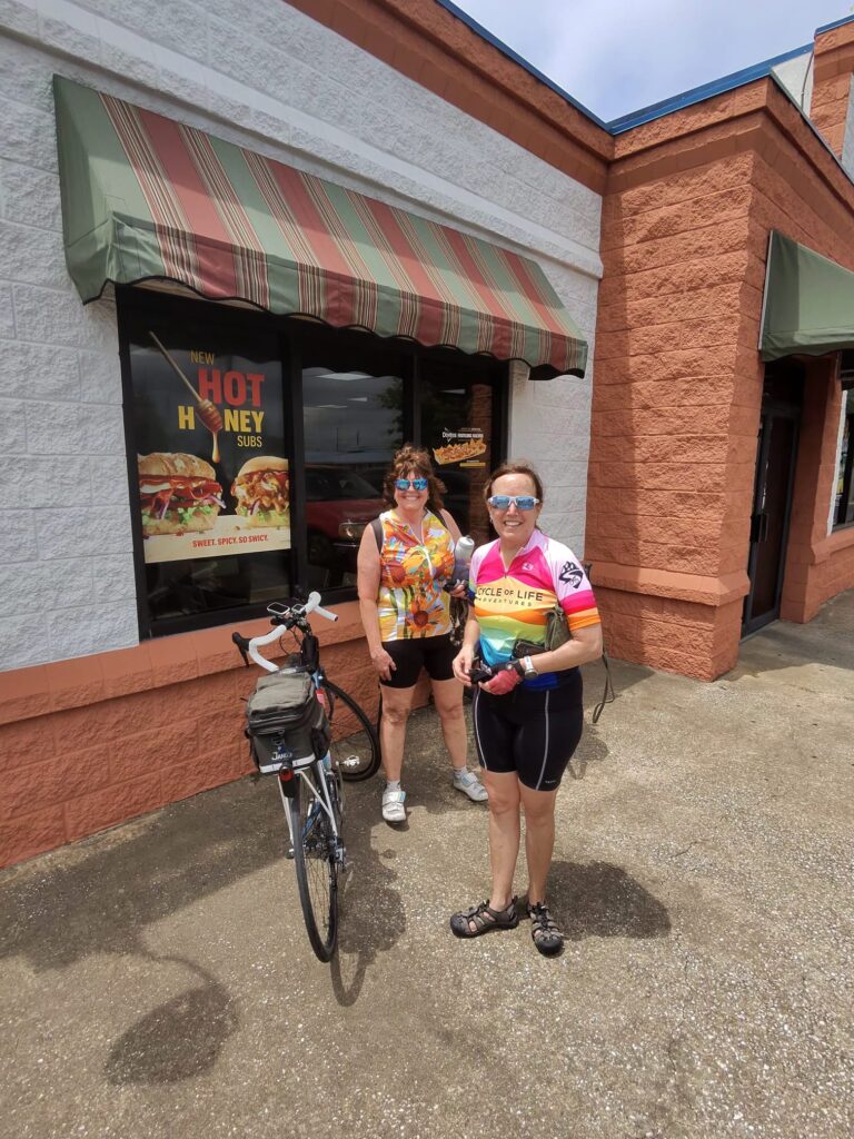 One of the “highlights” of our day is that we missed the lunch ladies. We don’t have specific directions on where lunch will be each day (at least we didn’t today) and apparently, the ladies thought we were at least 20 minutes out (trust me, we are not fast!). Anyway, we didn’t discover that we had missed lunch until we were a couple miles down a very busy road with no shoulder and I called to tell the ladies we would not be turning around, but would find our own lunch. Well, little did we know that we wouldn’t see anywhere to buy food until about half a mile from our hotel. So, the picture below shows our first makeshift stop ( a new friend, Brenda, was with us).