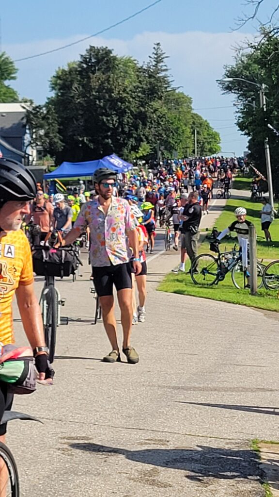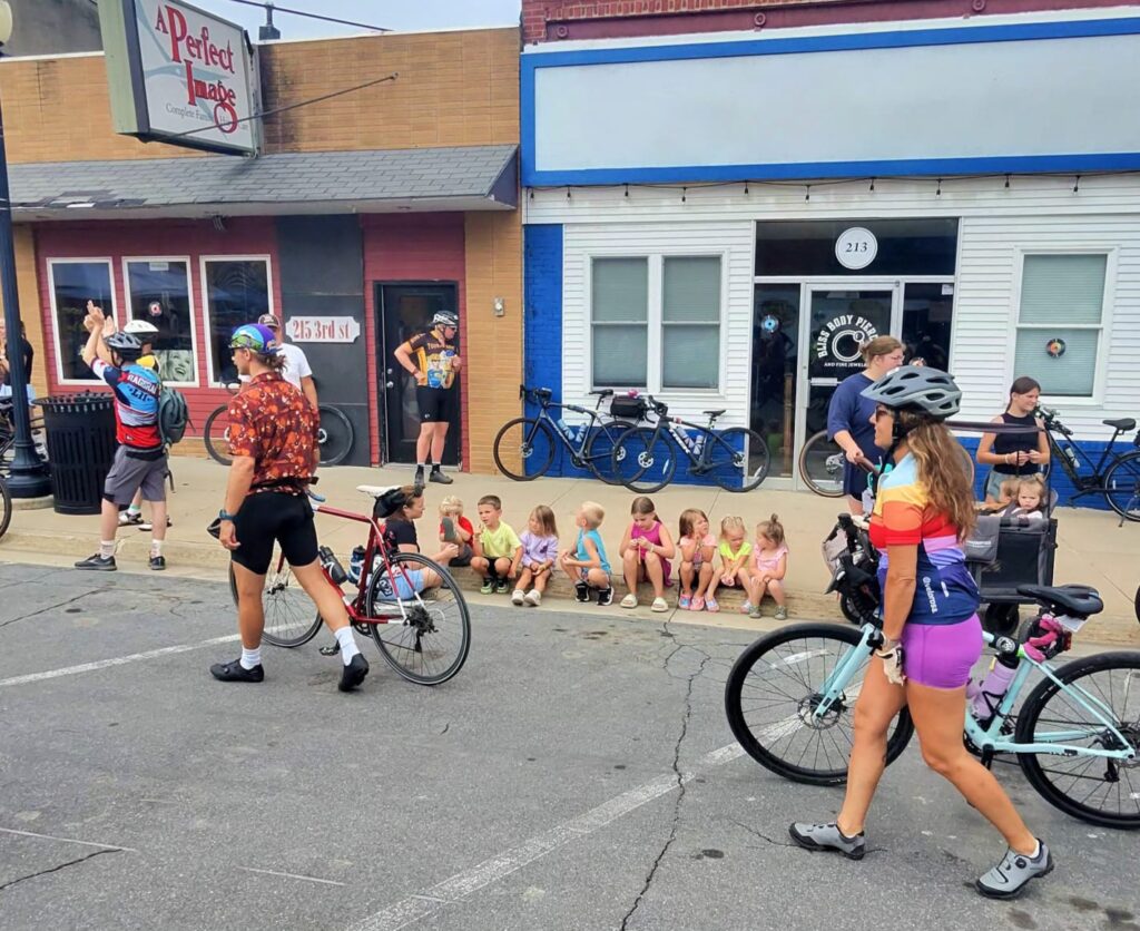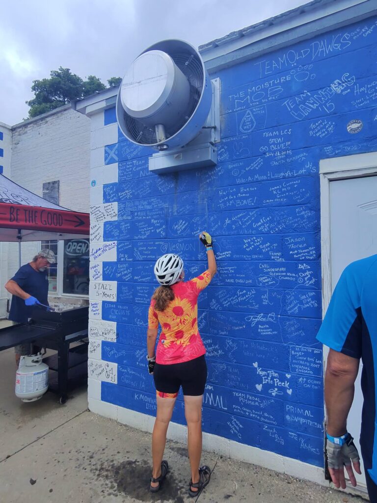 The second town of Aplington had some fun bicycle art and a wall to sign as well as the kids from day care lined up to welcome the riders.