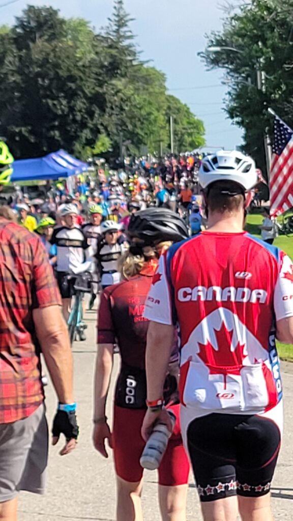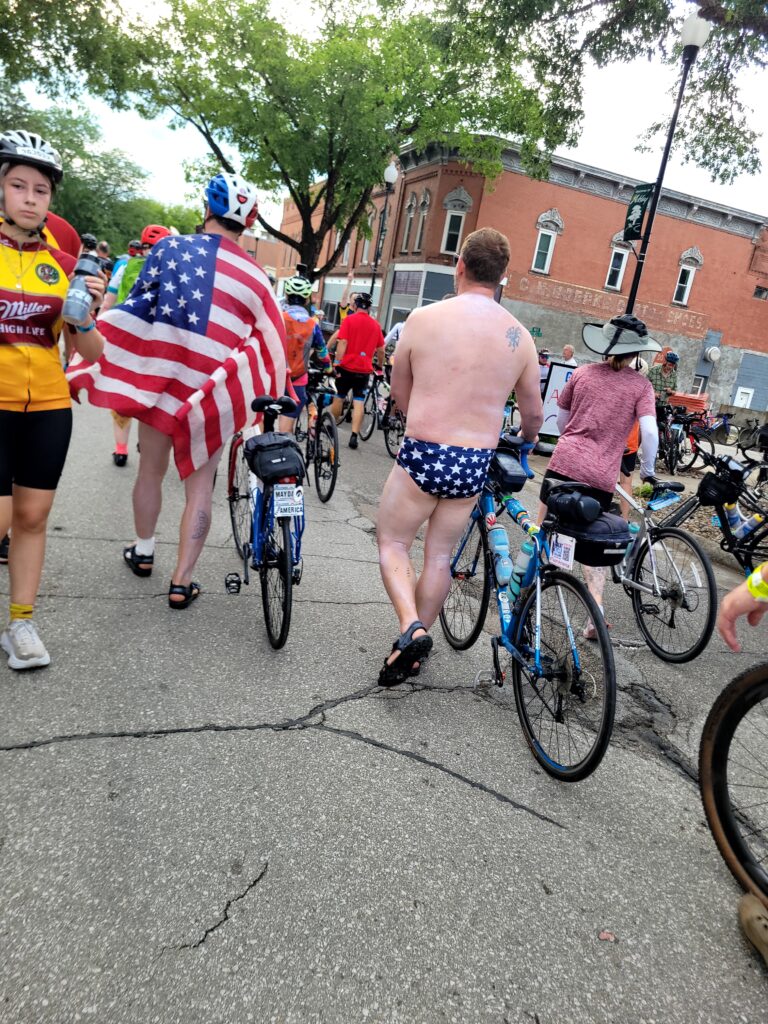 Today was wear your school colors or jersey day for RAGBRAI. We saw lots of schools represented, including one each from Arizona State and Univ of Cincinnati (and, ‘no’ Bill and I were not representing our schools). We saw the likes of Iowa, Iowa State, Notre Dame, Wisconsin, Washington, Indiana, Maryland, UCLA, USC, Texas A&M, Nebraska and many more. Which school do you think these guys attended?